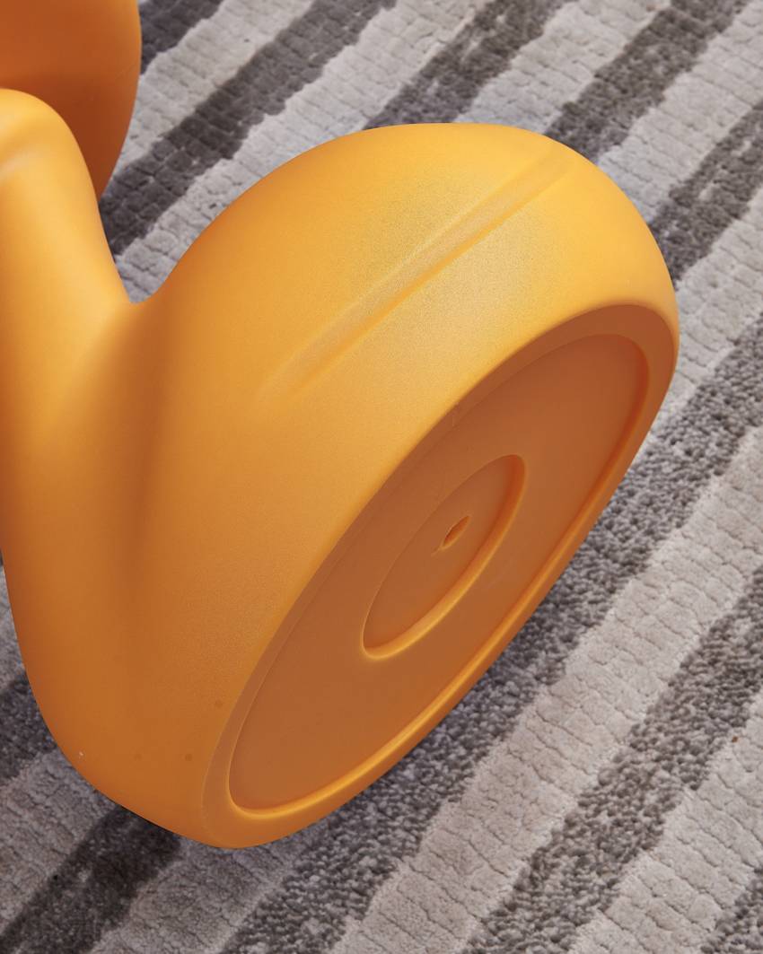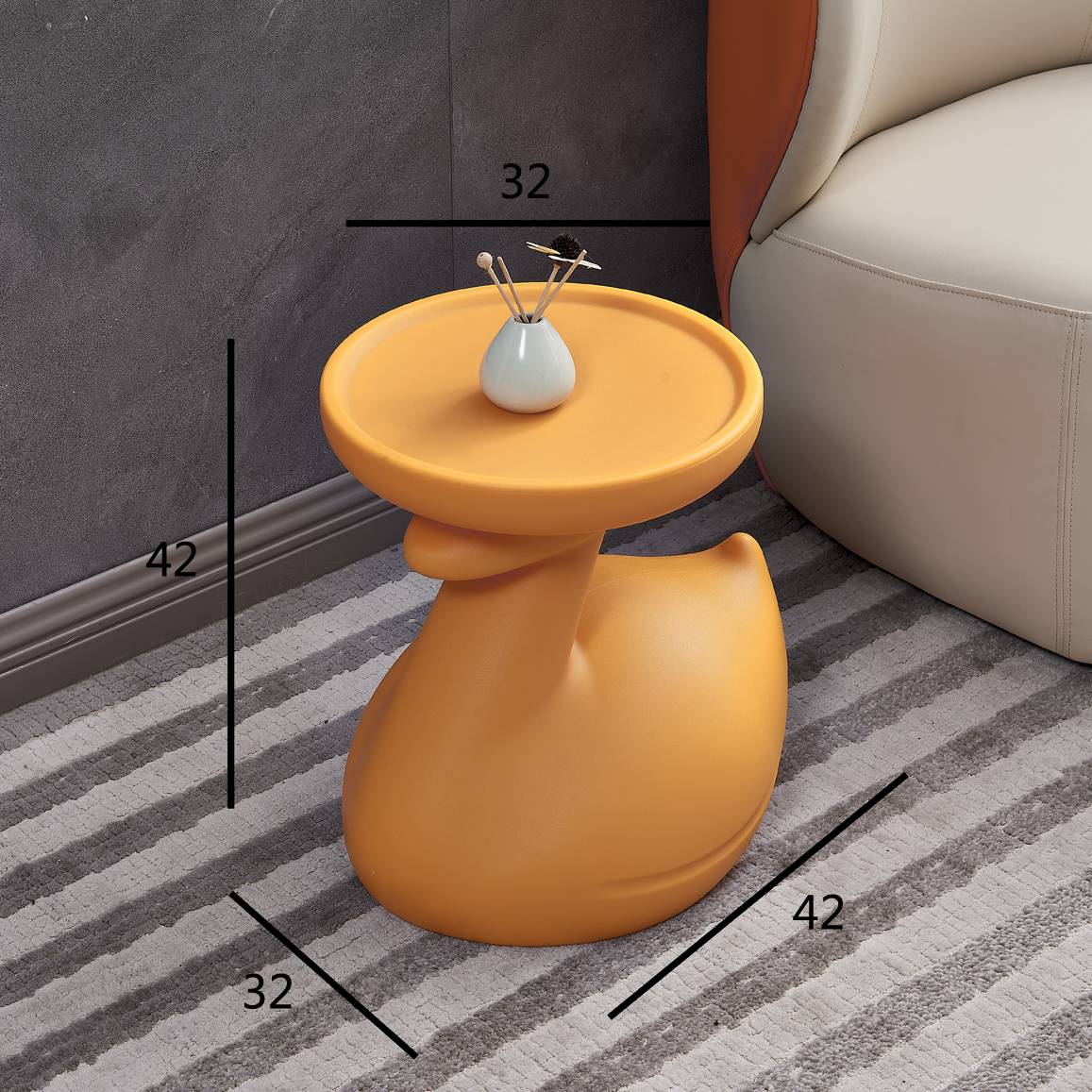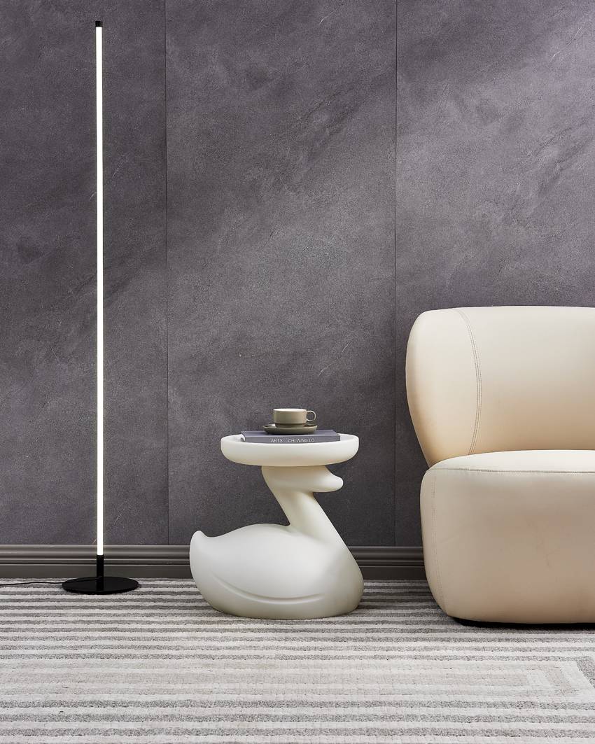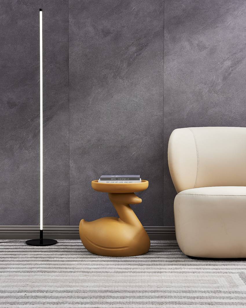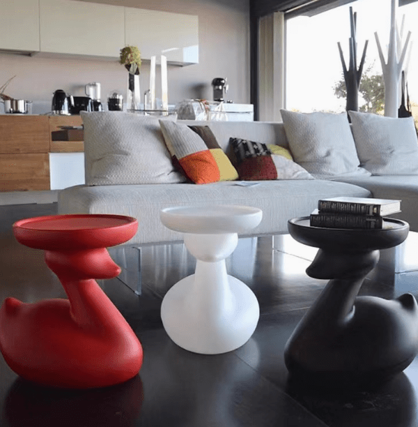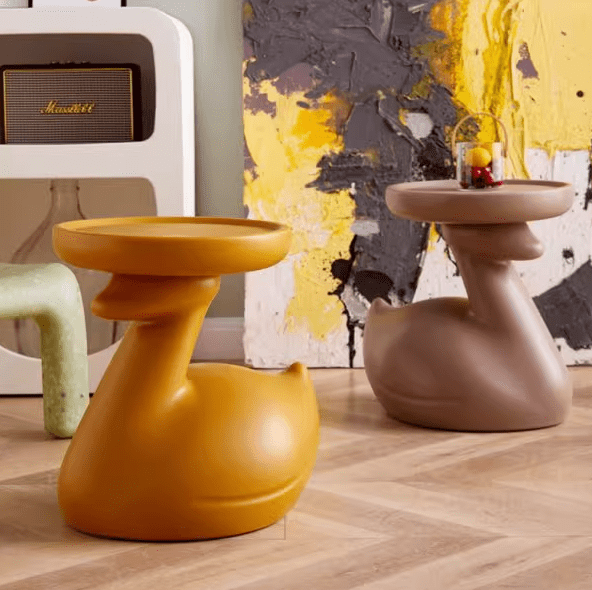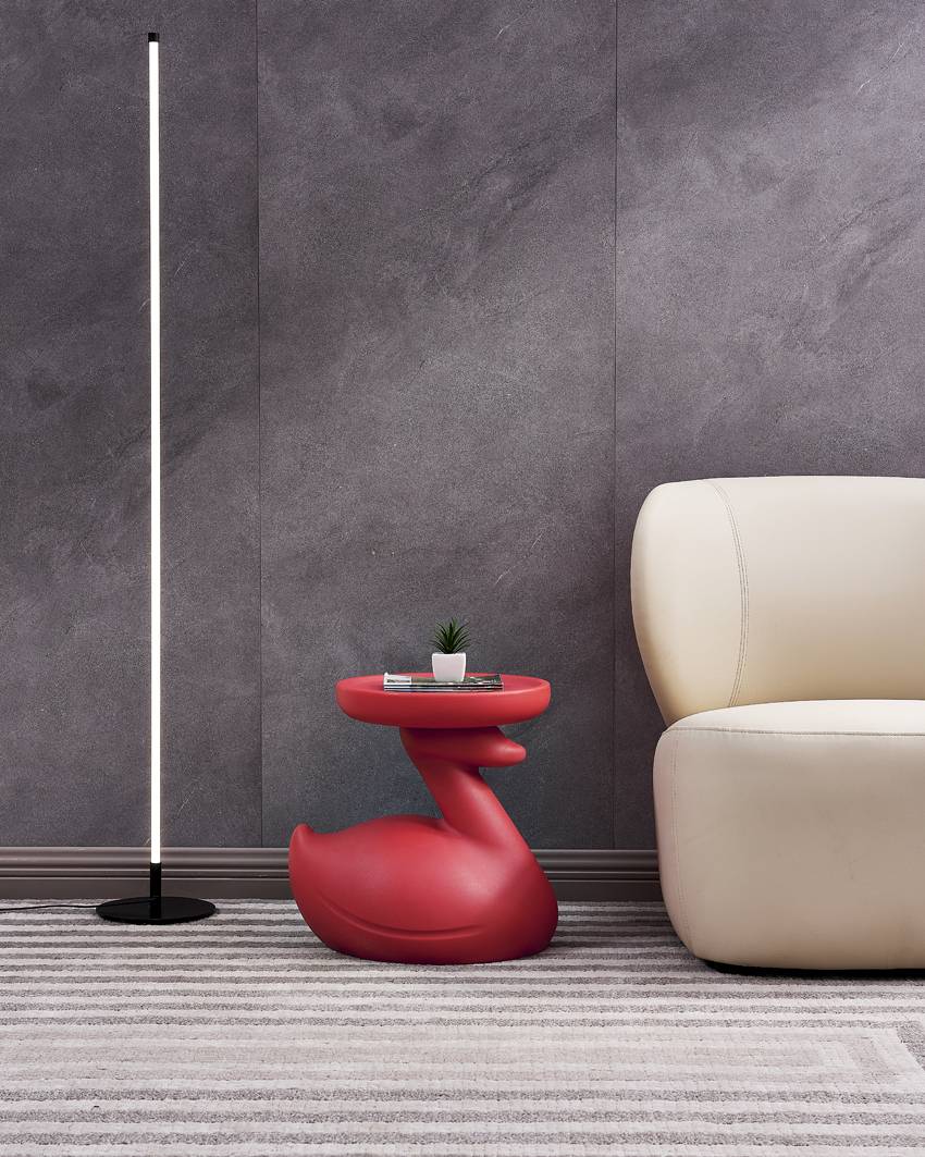 The swan-shaped side table, presented in a striking color, features rounded and smooth lines. Its swan head supports the tabletop, looking endearingly cute, adding a lively and playful vibe to the space.